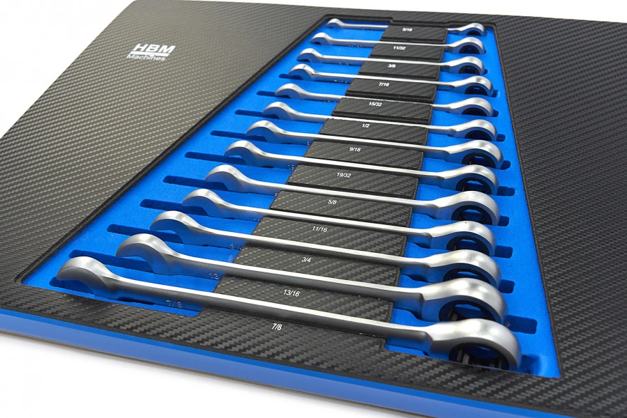 Een moertje en een boutje daar, het kan de dagelijkse praktijk zijn van veel mensen die in een technisch beroep werken. Met de ring, ratel en steeksleutelset van HBM, heb je diverse maten bij elkaar, zodat je altijd de juiste maat bij de hand hebt. Helemaal met de prachtige carbon foam inlay, raak jij jouw steeksleutels niet meer kwijt. De inlay past in HBM gereedschapswagens.