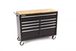 Het massief houten bovenblad van deze gereedschapswagen dient niet alleen als duurzame werkruimte, maar voegt ook een vleugje elegantie toe aan je werkplek. Hierop kun je probleemloos werken aan al je projecten.